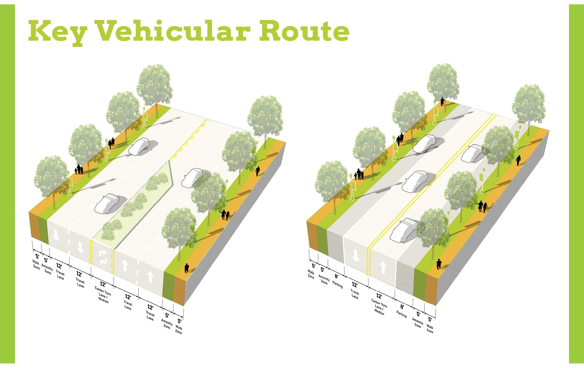 Thoroughfare Typologies were developed to analyze existing corridor conditions and create aspirational goals for future street design and streetscape.