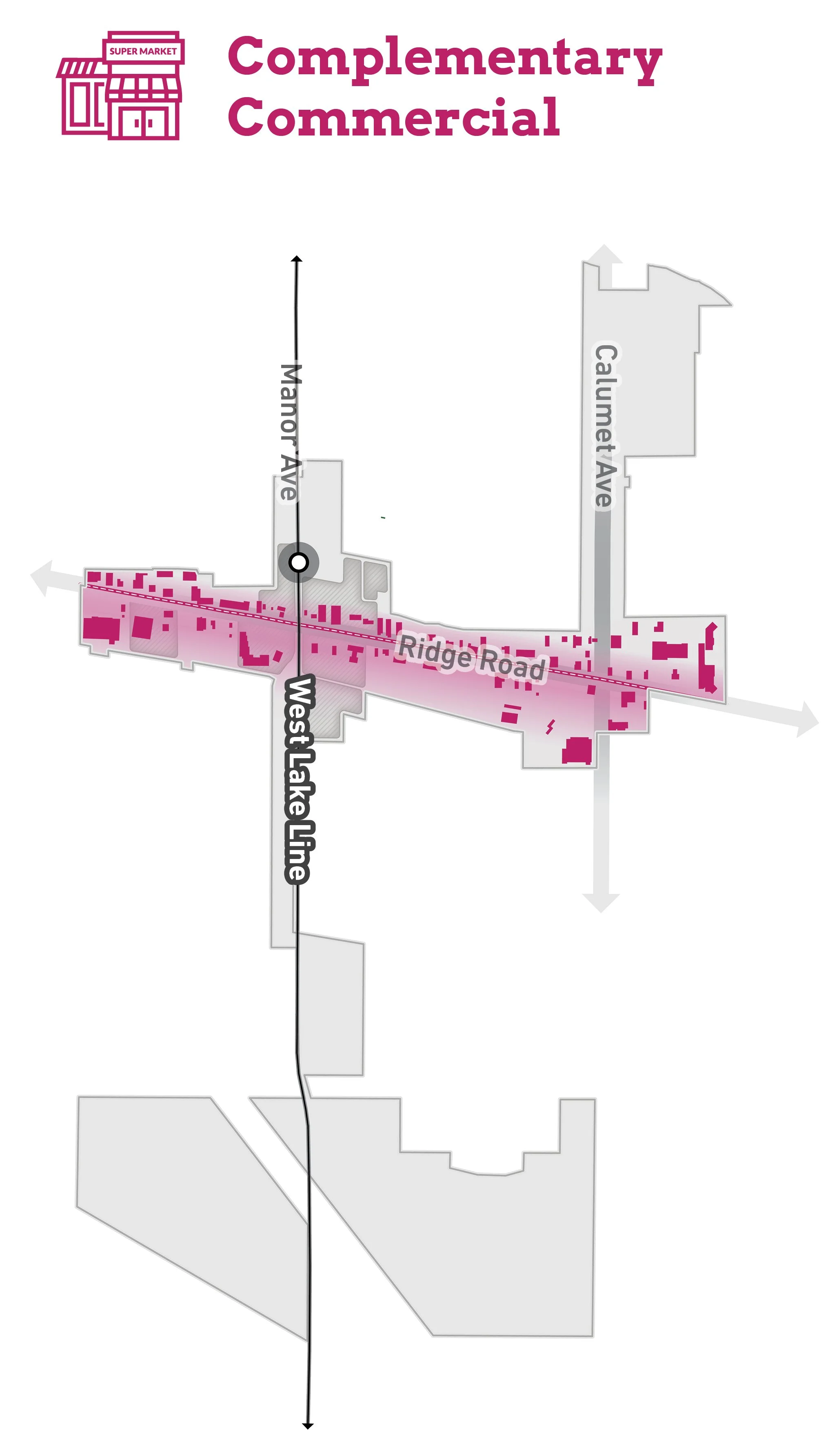 The opportunity for medium-density mixed-use TOD exists around the immediate station area. Walkability should be enhanced to the station area from nearby traditional neighborhoods and commercial corridors. Multiple opportunity sites for mixed-use development also exist along Ridge Road. Development should be complementary to the existing walkable commercial area and residential neighborhoods around the station. Ridge Road and Calumet Avenue streetscape improvements have been planned and designed for these two important commercial corridors. The Munster community has the unique ability to attract multiple housing types near the station.